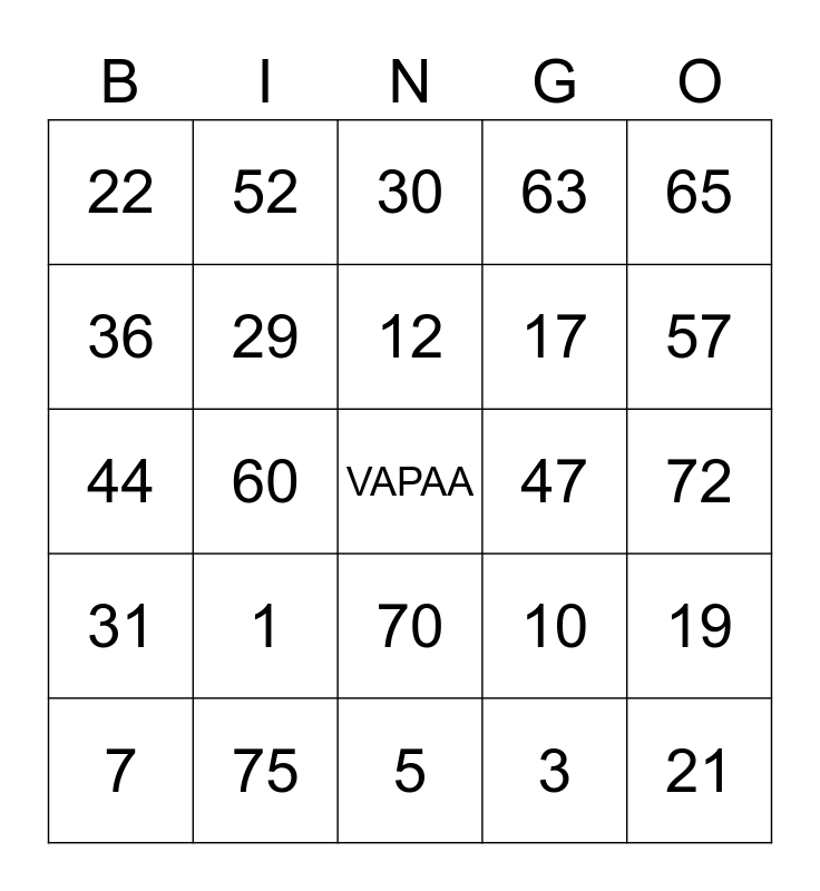 This bingo card has a free space and 24 words: 1, 75, 12, 7, 65, 22, 36, 52, 47, 70, 17, 44, 10, 19, 29, 3, 72, 30, 57, 60, 21, 31, 63 and 5.