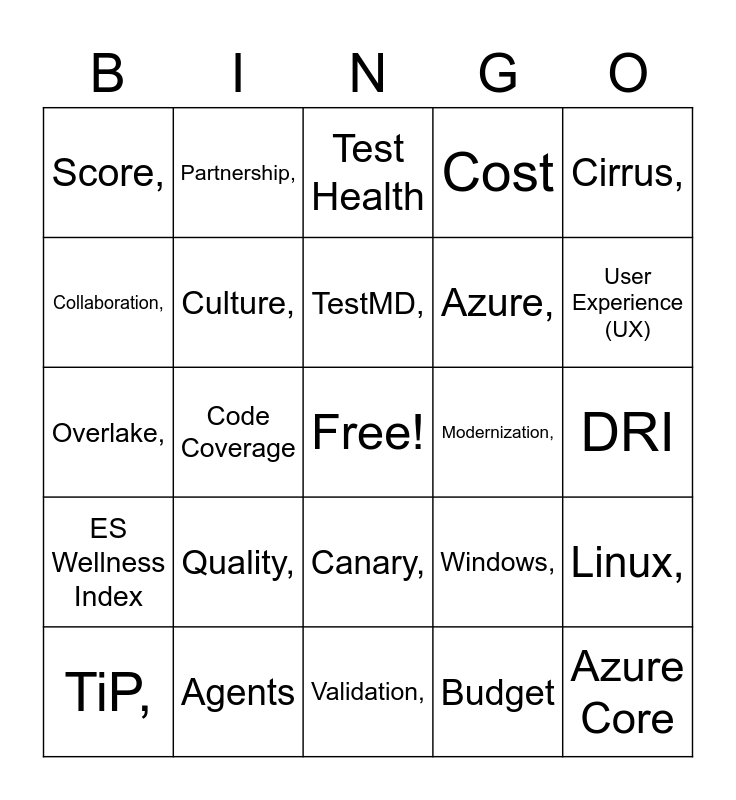 This bingo card has a free space and 25 words: Quality,, Validation,, TestMD,, TiP,, Cirrus,, Score,, Collaboration,, Partnership,, Modernization,, Canary,, Azure,, Overlake,, Windows,, Linux,, Culture,, CloudTest,, DRI, Test Health, User Experience (UX), Code Coverage, Azure Core, Agents, ES Wellness Index, Cost and Budget.