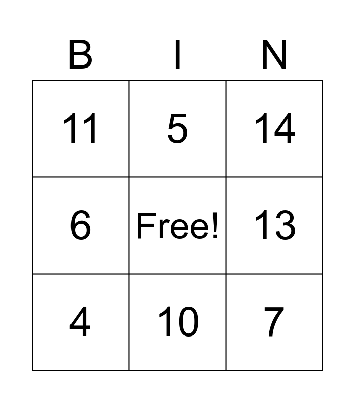 This bingo card has a free space and 14 words: 2, 3, 4, 5, 6, 7, 8, 9, 10, 11, 12, 13, 14 and 15.
