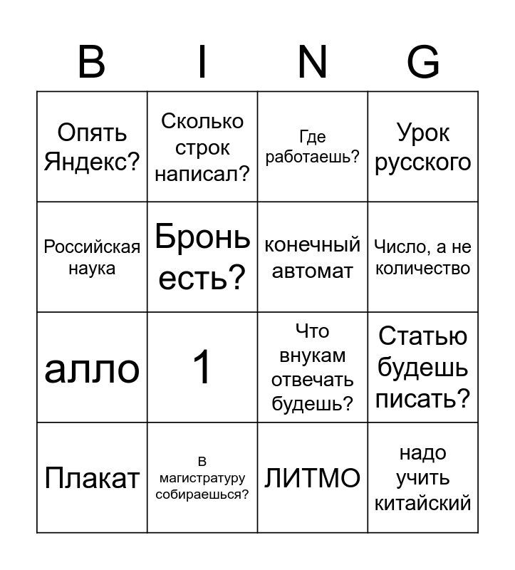 This bingo card has 16 words: В магистратуру собираешься?, Статью будешь писать?, Где работаешь?, Опять Яндекс?, алло, Сколько строк написал?, Что внукам отвечать будешь?, ЛИТМО, Российская наука, Бронь есть?, Плакат, Урок русского, 1, Число, а не количество, конечный автомат and надо учить китайский.