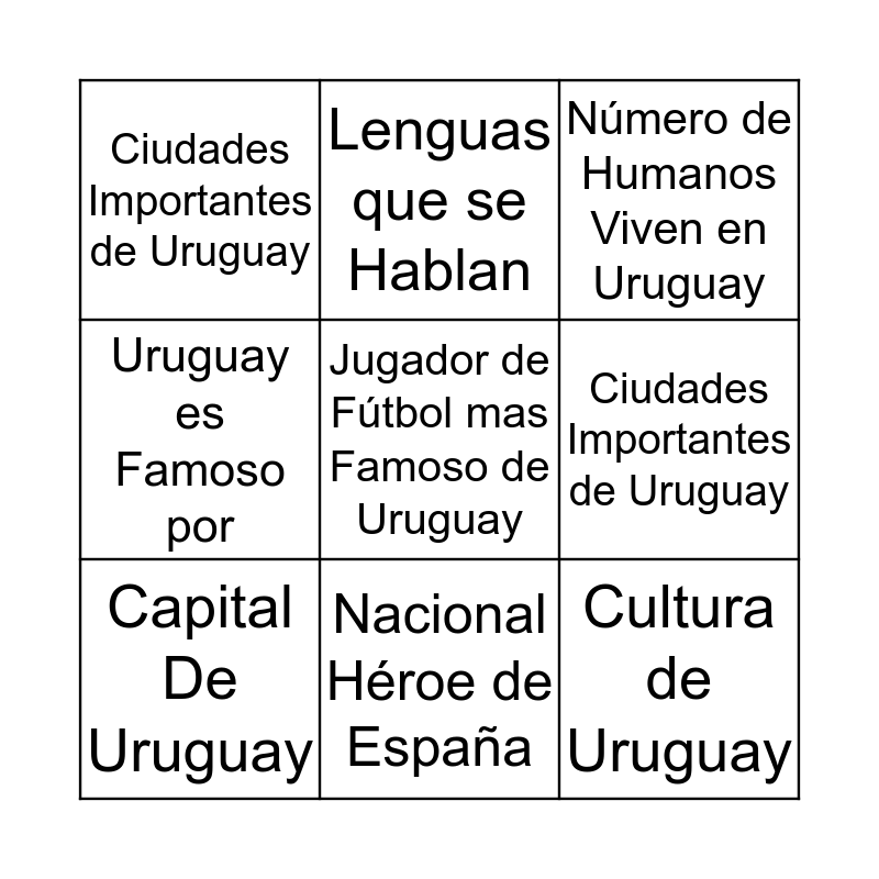 This bingo card has 9 words: Capital De Uruguay, Número de Humanos Viven en Uruguay, Lenguas que se Hablan, Uruguay es Famoso por, Ciudades Importantes de Uruguay, Ciudades Importantes de Uruguay, Jugador de Fútbol mas Famoso de Uruguay, Cultura de Uruguay and Nacional Héroe de España.