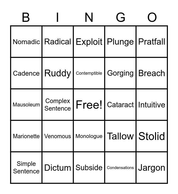 This bingo card has a free space and 29 words: Simple Sentence, Compound Sentence, Complex Sentence, compund complex sentence, Nomadic, Exploit, Ruddy, Venomous, Cataract, Dictum, Intuitive, Jargon, Subside, Condensations, Breach, Feigning, Monologue, Marionette, Pratfall, Mausoleum, Tallow, Flue, Gorging, Cadence, Plunge, Radical, Stolid, Contemptible and Teeming.