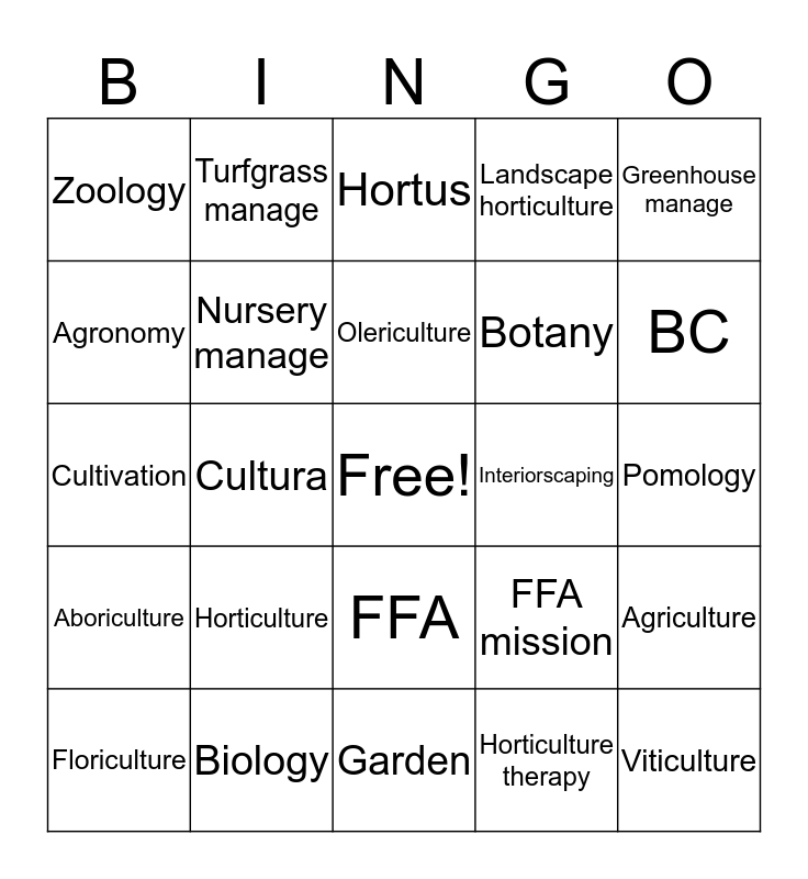 This bingo card has a free space and 24 words: Horticulture, Biology, Olericulture, Floriculture, Greenhouse manage, Zoology, Agronomy, Turfgrass manage, Interiorscaping, FFA, Botany, Cultivation, FFA mission, Agriculture, Nursery manage, Horticulture therapy, Pomology, Hortus, BC, Cultura, Viticulture, Aboriculture, Landscape horticulture and Garden.
