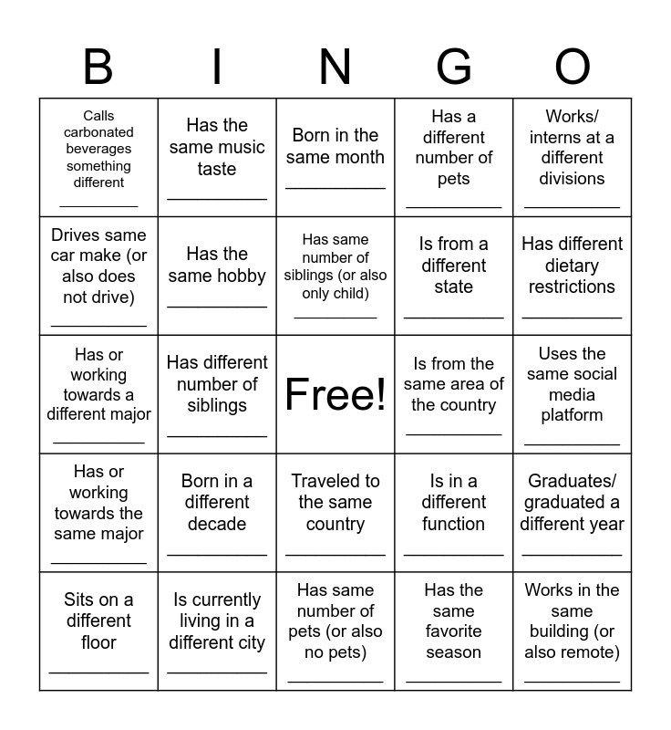 This bingo card has a free space and 24 words: Born in a different decade __________, Is currently living in a different city __________, Has same number of siblings (or also only child) __________, Sits on a different floor __________, Works/ interns at a different divisions __________, Calls carbonated beverages something different __________, Drives same car make (or also does not drive) __________, Has the same music taste __________, Is from the same area of the country __________, Traveled to the same country __________, Is from a different state __________, Has or working towards a different major __________, Is in a different function __________, Graduates/ graduated a different year __________, Has the same hobby __________, Has the same favorite season __________, Uses the same social media platform __________, Born in the same month __________, Has different dietary restrictions __________, Has different number of siblings __________, Works in the same building (or also remote) __________, Has or working towards the same major __________, Has a different number of pets __________ and Has same number of pets (or also no pets) __________.