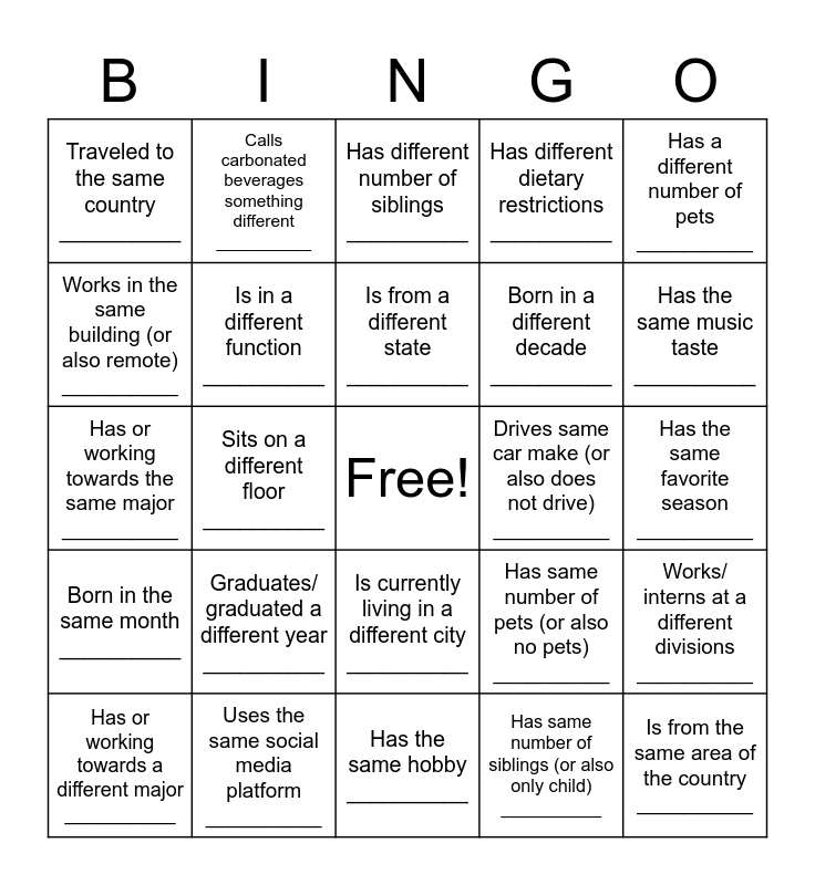 This bingo card has a free space and 24 words: Graduates/ graduated a different year __________, Uses the same social media platform __________, Is from a different state __________, Has or working towards a different major __________, Has a different number of pets __________, Traveled to the same country __________, Works in the same building (or also remote) __________, Calls carbonated beverages something different __________, Drives same car make (or also does not drive) __________, Is currently living in a different city __________, Born in a different decade __________, Has or working towards the same major __________, Has same number of pets (or also no pets) __________, Works/ interns at a different divisions __________, Is in a different function __________, Has same number of siblings (or also only child) __________, Has the same favorite season __________, Has different number of siblings __________, Has the same music taste __________, Sits on a different floor __________, Is from the same area of the country __________, Born in the same month __________, Has different dietary restrictions __________ and Has the same hobby __________.
