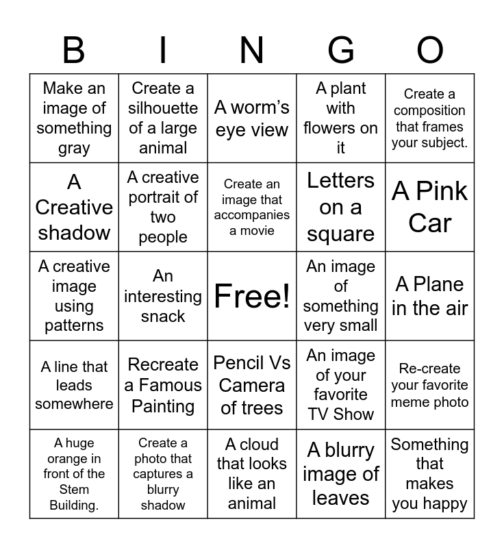 This bingo card has a free space and 24 words: Recreate a Famous Painting, Create a photo that captures a blurry shadow, Create an image that accompanies a movie, A huge orange in front of the Stem Building., Create a composition that frames your subject., Make an image of something gray, A Creative shadow, Create a silhouette of a large animal, An image of something very small, Pencil Vs Camera of trees, Letters on a square, A creative image using patterns, An image of your favorite TV Show, Re-create your favorite meme photo, A creative portrait of two people, A blurry image of leaves, A Plane in the air, A worm’s eye view, A Pink Car, An interesting snack, Something that makes you happy, A line that leads somewhere, A plant with flowers on it and A cloud that looks like an animal.