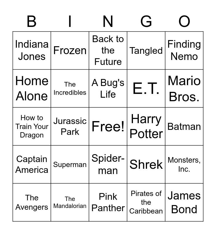 This bingo card has a free space and 29 words: The Avengers, Avatar, Jurassic Park, Star Wars, Indiana Jones, Back to the Future, The Incredibles, Superman, Harry Potter, The Mandalorian, Batman, James Bond, Pink Panther, Pirates of the Caribbean, Mario Bros., The Legend of Zelda, Spider-man, Captain America, Finding Nemo, How to Train Your Dragon, Shrek, The Lord of the Rings, E.T., Home Alone, Tangled, Frozen, Monsters, Inc., A Bug's Life and Mary Poppins.