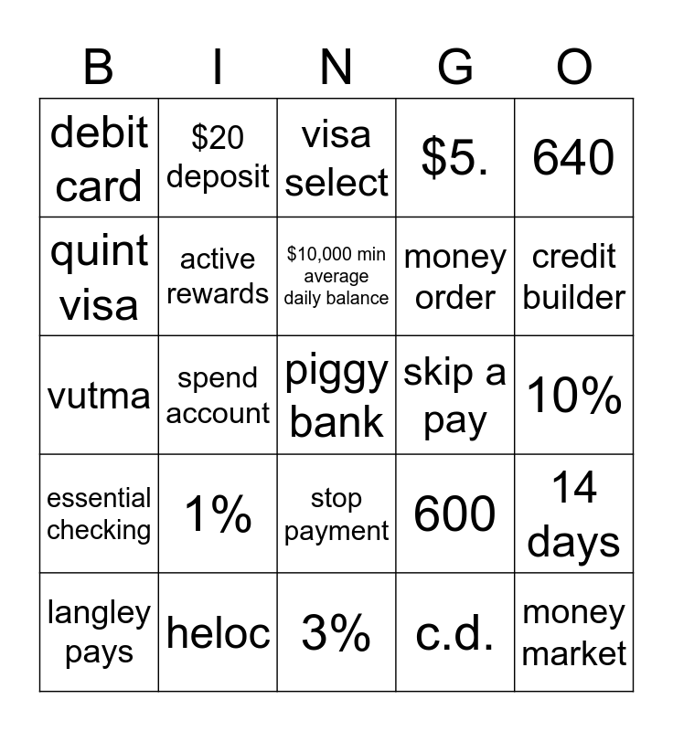 This bingo card has a free space and 29 words: langley pays, langley saves, spend account, cash back visa, debit card, visa select, active rewards, 1%, skip a pay, heloc, 10%, money market, 3%, c.d., credit builder, courtesy pay, stop payment, essential checking, 640, vutma, 600, silver select, money order, quint visa, $5., $20 deposit, 14 days, $10,000 min average daily balance and reloadable debit card.