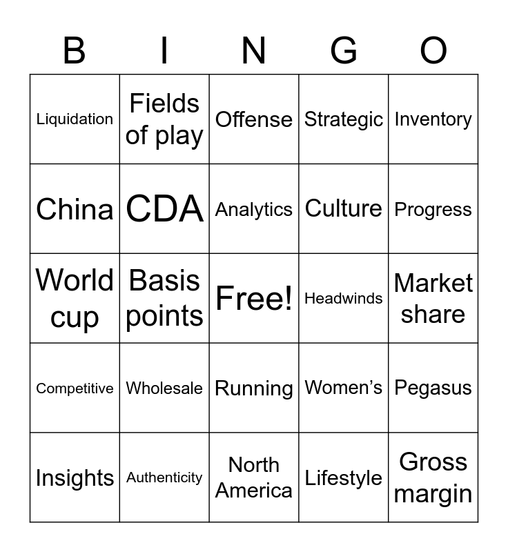This bingo card has a free space and 39 words: Innovation, APLA, Digital, CDA, Insights, Running, Analytics, Basketball, Inventory, Competitive, Basis points, Strategic, Gross margin, Market share, Headwinds, Wholesale, SG&A, Liquidation, Apparel, Women’s, China, North America, Culture, Progress, EMEA, O2O, Membership, Profitability, Jordan, Fields of play, Sneaker culture, Currency-neutral, Offense, Authenticity, Lifestyle, Momentum, Pegasus, World cup and Invincible.