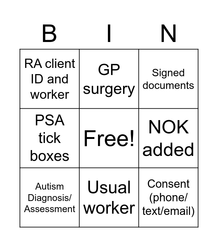 This bingo card has a free space and 11 words: 'Active' status, Usual worker, Consent (phone/ text/email), Autism Diagnosis/ Assessment, GP surgery, Signed documents, NOK added, Equal ops, PSA tick boxes, RA client ID and worker and Action Required.