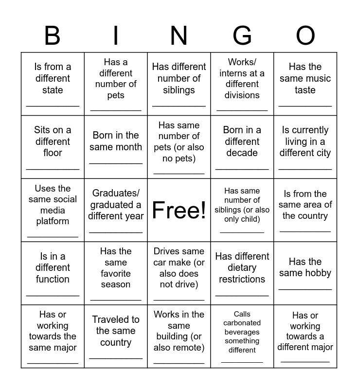This bingo card has a free space and 24 words: Has the same favorite season __________, Traveled to the same country __________, Has same number of pets (or also no pets) __________, Has or working towards the same major __________, Has the same music taste __________, Is from a different state __________, Sits on a different floor __________, Has a different number of pets __________, Has same number of siblings (or also only child) __________, Drives same car make (or also does not drive) __________, Born in a different decade __________, Uses the same social media platform __________, Has different dietary restrictions __________, Has the same hobby __________, Born in the same month __________, Calls carbonated beverages something different __________, Is from the same area of the country __________, Has different number of siblings __________, Is currently living in a different city __________, Graduates/ graduated a different year __________, Has or working towards a different major __________, Is in a different function __________, Works/ interns at a different divisions __________ and Works in the same building (or also remote) __________.