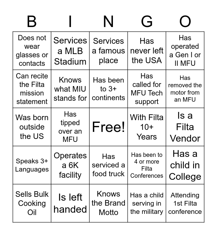 This bingo card has a free space and 24 words: Operates a 6K facility, Is left handed, Has been to 3+ continents, Sells Bulk Cooking Oil, Has operated a Gen I or II MFU, Does not wear glasses or contacts, Can recite the Filta mission statement, Services a MLB Stadium, With Filta 10+ Years, Has serviced a food truck, Has called for MFU Tech support, Was born outside the US, Has been to 4 or more Filta Conferences, Has a child in College, Knows what MIU stands for, Has a child serving in the military, Is a Filta Vendor, Services a famous place, Has removed the motor from an MFU, Has tipped over an MFU, Attending 1st Filta conference, Speaks 3+ Languages, Has never left the USA and Knows the Brand Motto.