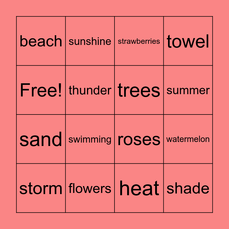 This bingo card has 16 words: flowers, watermelon, strawberries, beach, sand, sunshine, roses, heat, Free!, thunder, storm, towel, swimming, summer, trees and shade.