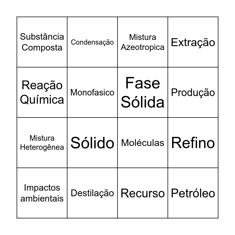 This bingo card has 40 words: Densidade, Moléculas, Fase Líquida, Fase Sólida, Matéria, Reserva, Produção, Pré-sal, Reação Química, Petróleo, Refino, Extração, Impactos ambientais, Recurso, Destilação, Substância Química, Substância Simples, Substância Composta, Mistura, Mistura Azeotropica, Mistura Eutetica, Mistura Homogênea, Mistura Heterogênea, Monofasico, Bifásico, Trifásico, Tetrafasico, Fenômeno Fisico, Fenômeno Químico, Fusão, Ebulição, Solidificação, Vaporização, Liquefação, Sólido, Líquido, Vapor, Temperatura, Condensação and Sublimação.