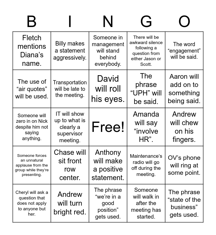 This bingo card has a free space and 24 words: Chase will sit front row center., Andrew will turn bright red., David will roll his eyes., Cheryl will ask a question that does not apply to anyone but her., The word “engagement” will be said., Fletch mentions Diana’s name., The use of “air quotes” will be used., Billy makes a statement aggressively., Amanda will say “involve HR”., Anthony will make a positive statement., The phrase “UPH” will be said., Someone will zero in on Nick despite him not saying anything., Maintenance’s radio will go off during the meeting., OV’s phone will ring at some point., Transportation will be late to the meeting., Someone will walk in after the meeting has started., Andrew will chew on his fingers., Someone in management will stand behind everybody., Aaron will add on to something being said., IT will show up to what is clearly a supervisor meeting., The phrase “state of the business” gets used., Someone forces an unnatural applause from the group while they’re presenting., There will be awkward silence following a question from either Jason or Scott. and The phrase “we’re in a good position” gets used..