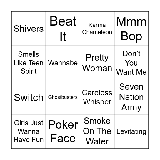 This bingo card has 46 words: Happy, Girls Just Wanna Have Fun, Uptown Girl, Sweet Escape, There Must Be An Angel, Truth Hurts, Beat It, As It Was, Wannabe, Leave The Door Open, Pretty Woman, Mmm Bop, Mambo No. 5, Just Dance, Eye Of The Tiger, S.O.S., Don’t You Want Me, Poker Face, Never Gonna Give You Up, Smells Like Teen Spirit, Seven Nation Army, Hawaii Five-O, Shivers, Switch, Piña Colada Song, Ghostbusters, Take On Me, Light My Fire, Super Freak, Levitating, Down Under, Your Song, Blinding Lights, Single Ladies, Sir Duke, Man I Feel Like A Woman, Smoke On The Water, Billie Jean, Crocodile Rock, Let’s Groove, Baby One More Time, Karma Chameleon, Careless Whisper, Uptown Funk, Crazy and September.