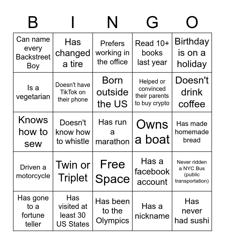 This bingo card has 44 words: Has lived outside the US, Has run a marathon, Met a celebrity, Has gone to a fortune teller, Knows how to surf, Has a nickname, Prefers working in the office, Left handed, Birthday is on a holiday, Has visited at least 30 US States, Read 10+ books last year, Owns a boat, Free Space, Twin or Triplet, Been on a reality show, Has been to the Olympics, Played sport in college, Knows how to sew, Has been scuba diving, Doesn't drink coffee, Has changed a tire, Has a pet (other than a dog or a cat), Doesn't like chocolate, Can name every Backstreet Boy, Can define mortgage insurance, Has made homemade bread, Knows how to do double dutch, Walked more than 10,000 steps today, Has a facebook account, Driven a motorcycle, Has worked as a food server, Never ridden a NYC Bus (public transportation), Is an only child, Has corrected someone's pronounciation or spelling of 'Lukka', Doesn't know how to whistle, Can quickly convert between Celsius and Farenheit, Prefers Pepsi over Coke, Has never had sushi, Born outside the US, Is a vegetarian, Helped or convinced their parents to buy crypto, Is wearing something green, Doesn't have TikTok on their phone and Is a New England Patriots fan.