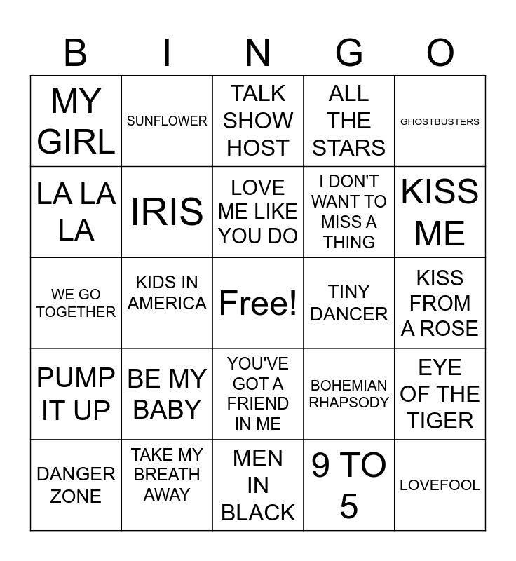 This bingo card has a free space and 29 words: DANGER ZONE, GANGSTA'S PARADISE, KIDS IN AMERICA, LOSE YOURSELF, MY GIRL, TALK SHOW HOST, IRIS, BE MY BABY, TINY DANCER, TAKE MY BREATH AWAY, KISS FROM A ROSE, LOVEFOOL, MEN IN BLACK, 9 TO 5, KISS ME, LIVE & LET DIE, YOU'VE GOT A FRIEND IN ME, PUMP IT UP, GHOSTBUSTERS, WE GO TOGETHER, BOHEMIAN RHAPSODY, LADY MARMALADE, I DON'T WANT TO MISS A THING, LA LA LA, ALL THE STARS, SUNFLOWER, EYE OF THE TIGER, LOVE ME LIKE YOU DO and DEVIL'S PIE.
