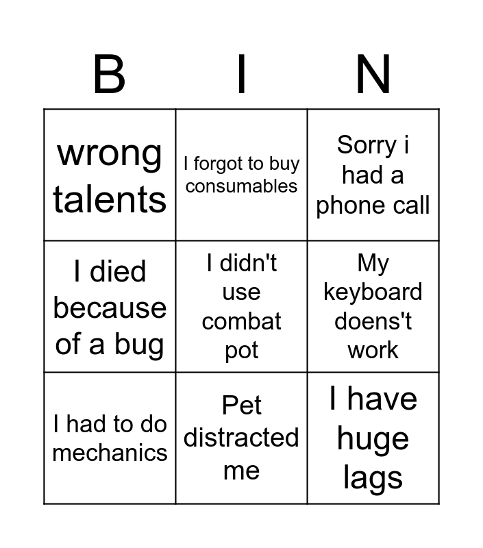 This bingo card has 9 words: I had to do mechanics, Sorry i had a phone call, I forgot to buy consumables, I died because of a bug, wrong talents, My keyboard doens't work, I didn't use combat pot, I have huge lags and Pet distracted me.