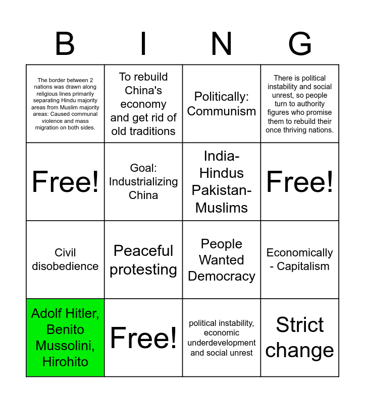 This bingo card has 18 words: Peaceful protesting, Strict change, Politically: Communism, The border between 2 nations was drawn along religious lines primarily separating Hindu majority areas from Muslim majority areas: Caused communal violence and mass migration on both sides., People Wanted Democracy, There is political instability and social unrest, so people turn to authority figures who promise them to rebuild their once thriving nations., Adolf Hitler, Benito Mussolini, Hirohito, To rebuild China's economy and get rid of old traditions, Free!, Civil disobedience, political instability, economic underdevelopment and social unrest, Free!, Economically - Capitalism, Goal: Industrializing China, India-Hindus Pakistan-Muslims, Began protests for more radical reforms such as democracy, Free! and UN.