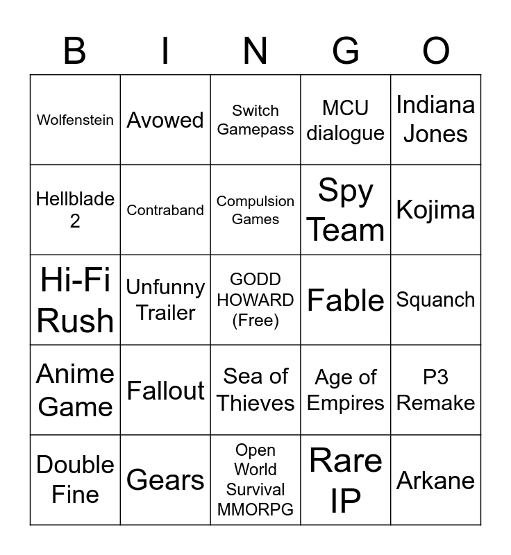 This bingo card has a free space and 24 words: Fallout, Gears, Compulsion Games, Double Fine, Indiana Jones, Wolfenstein, Hellblade 2, Avowed, Fable, Sea of Thieves, Spy Team, Hi-Fi Rush, Age of Empires, P3 Remake, Contraband, Rare IP, Squanch, Switch Gamepass, Kojima, Unfunny Trailer, Arkane, Anime Game, MCU dialogue and Open World Survival MMORPG.