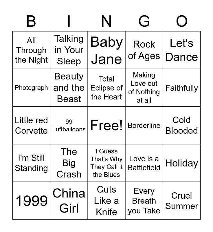This bingo card has a free space and 29 words: 1999, 2000 Miles, 99 Luftballoons, All Night Long, All Through the Night, Baby Jane, Beauty and the Beast, The Big Crash, Borderline, China Girl, Cold Blooded, Cruel Summer, Cuts Like a Knife, Every Breath you Take, Faithfully, Gimme All Your Lovin', I Guess That's Why They Call it the Blues, I'm Still Standing, Let's Dance, Little red Corvette, Love is a Battlefield, Mad World, Making Love out of Nothing at all, Photograph, Rock of Ages, Talking in Your Sleep, Holiday, Total Eclipse of the Heart and Uptown Girl.
