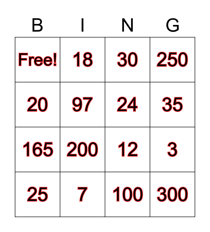 This bingo card has 16 words: 25, 7, 30, 250, 20, 18, 12, 3, Free!, 97, 100, 35, 165, 200, 24 and 300.