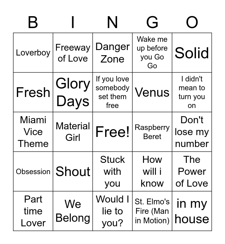 This bingo card has a free space and 49 words: i can't wait, in my house, Born In the USA, Would I lie to you?, Shout, Axel F (Beverly Hills Cop), Freeway of Love, You Give Love a Bad Name, Fresh, Kiss, Glory Days, Wake me up before you Go Go, The Power of Love, How will i know, Easy Lover, smooth operator, If you love somebody set them free, Raspberry Beret, The boys of summer, Solid, Material Girl, St. Elmo's Fire (Man in Motion), Loverboy, Venus, Rhythm of the night, I didn't mean to turn you on, Part time Lover, Better be good to me, Stuck with you, Obsession, Sledgehammer, All she wants to do is dance, Do what you do, Higher love, We Belong, we built this city, Summer of 69, take on me, Don't lose my number, sea of love, Conga, What Have you Done for me Lately, Jungle Love, Misled, Miami Vice Theme, Danger Zone, Rock me Amadeus, Walking on Sunshine and I feel for you.