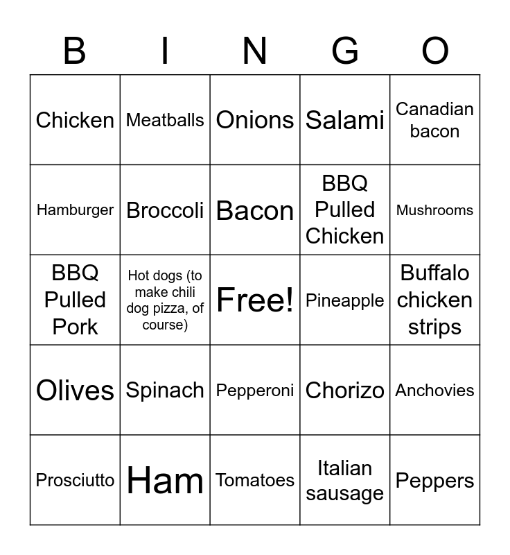 This bingo card has a free space and 26 words: Pepperoni, Italian sausage, Bacon, Ham, Canadian bacon, Chicken, Hamburger, Meatballs, Buffalo chicken strips, Chorizo, BBQ Pulled Chicken, BBQ Pulled Pork, Anchovies, Prosciutto, Hot dogs (to make chili dog pizza, of course), Cheese, Salami, Olives, Onions, Peppers, Mushrooms, Tomatoes, Pineapple, Spinach, Broccoli and Roasted Red Peppers.