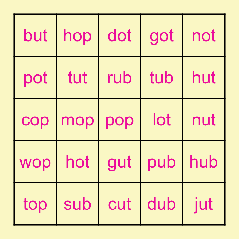 This bingo card has 25 words: hot, cut, rub, top, not, but, pot, hop, lot, gut, tub, cop, pub, hub, tut, jut, nut, dot, hut, mop, pop, sub, wop, got and dub.