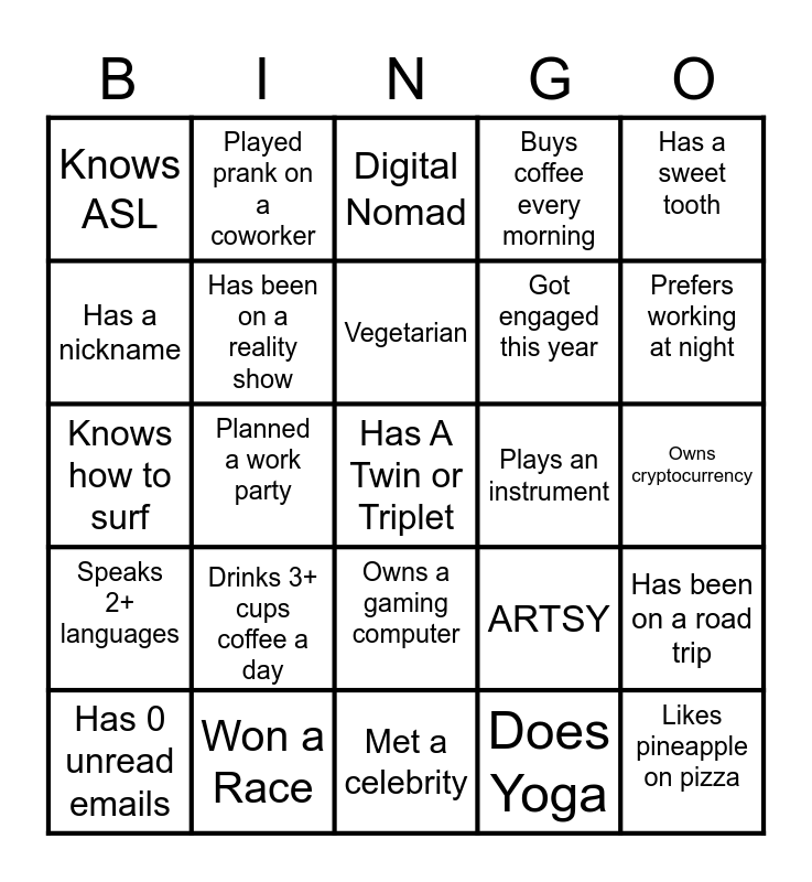 This bingo card has 25 words: Drinks 3+ cups coffee a day, Met a celebrity, Vegetarian, Has 0 unread emails, Has a sweet tooth, Knows ASL, Has a nickname, Played prank on a coworker, Plays an instrument, Owns a gaming computer, Got engaged this year, Knows how to surf, ARTSY, Has been on a road trip, Has been on a reality show, Likes pineapple on pizza, Owns cryptocurrency, Digital Nomad, Prefers working at night, Planned a work party, Has A Twin or Triplet, Won a Race, Speaks 2+ languages, Buys coffee every morning and Does Yoga.