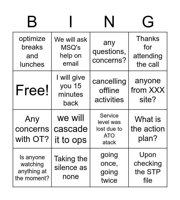 This bingo card has 16 words: Taking the silence as none, What is the action plan?, any questions, concerns?, optimize breaks and lunches, Any concerns with OT?, We will ask MSQ's help on email, Service level was lost due to ATO atack, going once, going twice, Free!, I will give you 15 minutes back, Is anyone watching anything at the moment?, Thanks for attending the call, we will cascade it to ops, anyone from XXX site?, cancelling offline activities and Upon checking the STP file.