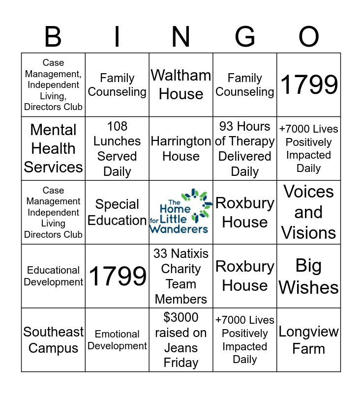 This bingo card has a free space and 61 words: Behavioral Development, Emotional Development, Social Development, Educational Development, +7000 Lives Positively Impacted Daily, 105 Breakfasts Served Daily, 108 Lunches Served Daily, 105 Dinners Served Daily, 93 Hours of Therapy Delivered Daily, 39 Children Placed in Intensive Foster Care Daily, Family Counseling, Adoption & Foster Care, Mental Health Services, Special Education, Therapeutic Residential Program, Case Management, Independent Living, Directors Club, Longview Farm, 1799, Voices and Visions, Harrington House, Roxbury House, Waltham House, Southeast Campus, Big Wishes, Behavioral Development, Emotional Development, Social Development, Educational Development, +7000 Lives Positively Impacted Daily, 105 Breakfasts Served Daily, 108 Lunches Served Daily, 105 Dinners Served Daily, 93 Hours of Therapy Delivered Daily, 39 Children Placed in Intensive Foster Care Daily, Family Counseling, Adoption & Foster Care, Mental Health Services, Special Education, Therapeutic Residential Program, Case Management Independent Living Directors Club, Longview Farm, 1799, Voices and Visions, Harrington House, Roxbury House, Waltham House, Southeast Campus, Big Wishes, Adopt a Family, 33 Natixis Charity Team Members, $3000 raised on Jeans Friday, Joan Wallace Benjamin – CEO, John Hailer – Past Chairman of the Board, Nevins Farm, $148k goal for employee giving in 2016, Generous Masters, Thank-you-a-thon, Sharon Wratchford, Ice Cream Social, Amanda Madden – Charity Champion and Empowerment Day.