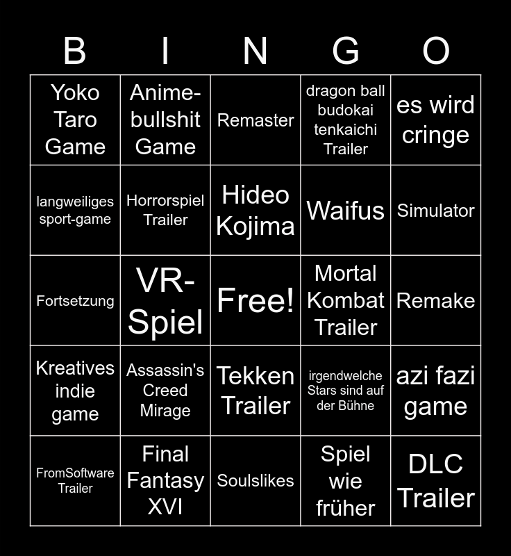 This bingo card has a free space and 24 words: Assassin's Creed Mirage, Final Fantasy XVI, Hideo Kojima, FromSoftware Trailer, es wird cringe, Yoko Taro Game, langweiliges sport-game, Anime-bullshit Game, Mortal Kombat Trailer, Tekken Trailer, Waifus, Fortsetzung, irgendwelche Stars sind auf der Bühne, azi fazi game, Horrorspiel Trailer, Spiel wie früher, Remake, Remaster, Simulator, VR-Spiel, DLC Trailer, Kreatives indie game, dragon ball budokai tenkaichi Trailer and Soulslikes.