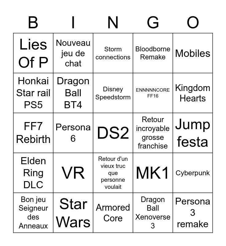 This bingo card has a free space and 24 words: VR, Star Wars, Disney Speedstorm, Bon jeu Seigneur des Anneaux, Mobiles, Lies Of P, Honkai Star rail PS5, Nouveau jeu de chat, Retour incroyable grosse franchise, Retour d'un vieux truc que personne voulait, ENNNNNCORE FF16, FF7 Rebirth, MK1, Cyberpunk, Dragon Ball BT4, Dragon Ball Xenoverse 3, Jump festa, Storm connections, Kingdom Hearts, Persona 6, Persona 3 remake, Elden Ring DLC, Bloodborne Remake and Armored Core.