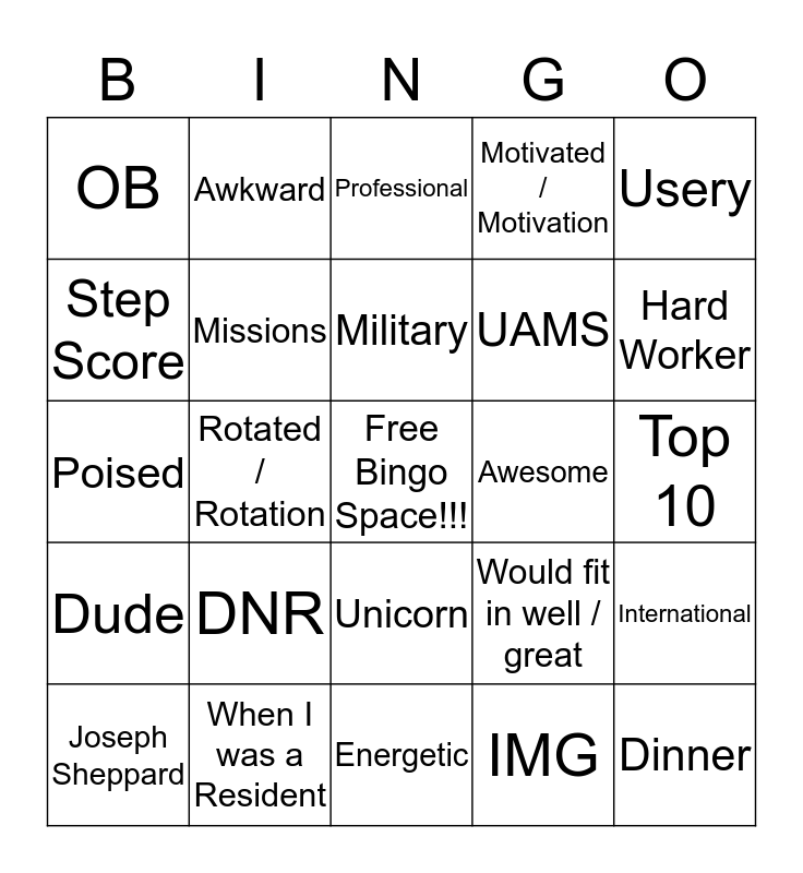 This bingo card has a free space and 24 words: DNR, When I was a Resident, Military, Joseph Sheppard, Usery, OB, Step Score, Awkward, Awesome, Unicorn, UAMS, Poised, Would fit in well / great, International, Missions, IMG, Top 10, Professional, Hard Worker, Rotated / Rotation, Dinner, Dude, Motivated / Motivation and Energetic.