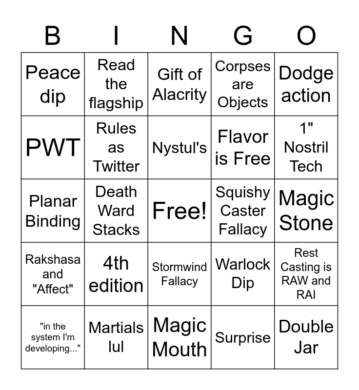 This bingo card has a free space and 24 words: 4th edition, Martials lul, Nystul's, "in the system I'm developing...", Dodge action, Peace dip, PWT, Read the flagship, Squishy Caster Fallacy, Stormwind Fallacy, Flavor is Free, Planar Binding, Warlock Dip, Rest Casting is RAW and RAI, Rules as Twitter, Surprise, Magic Stone, Gift of Alacrity, 1" Nostril Tech, Death Ward Stacks, Double Jar, Rakshasa and "Affect", Corpses are Objects and Magic Mouth.