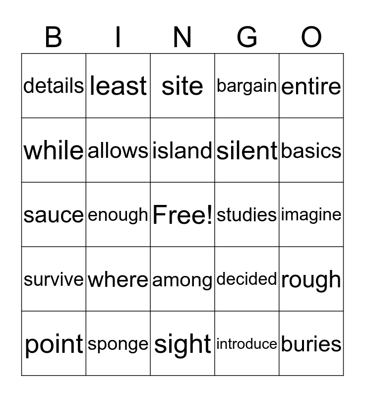 This bingo card has a free space and 24 words: where, sponge, island, point, entire, details, while, least, studies, among, silent, sauce, decided, rough, allows, introduce, imagine, site, basics, enough, buries, survive, bargain and sight.