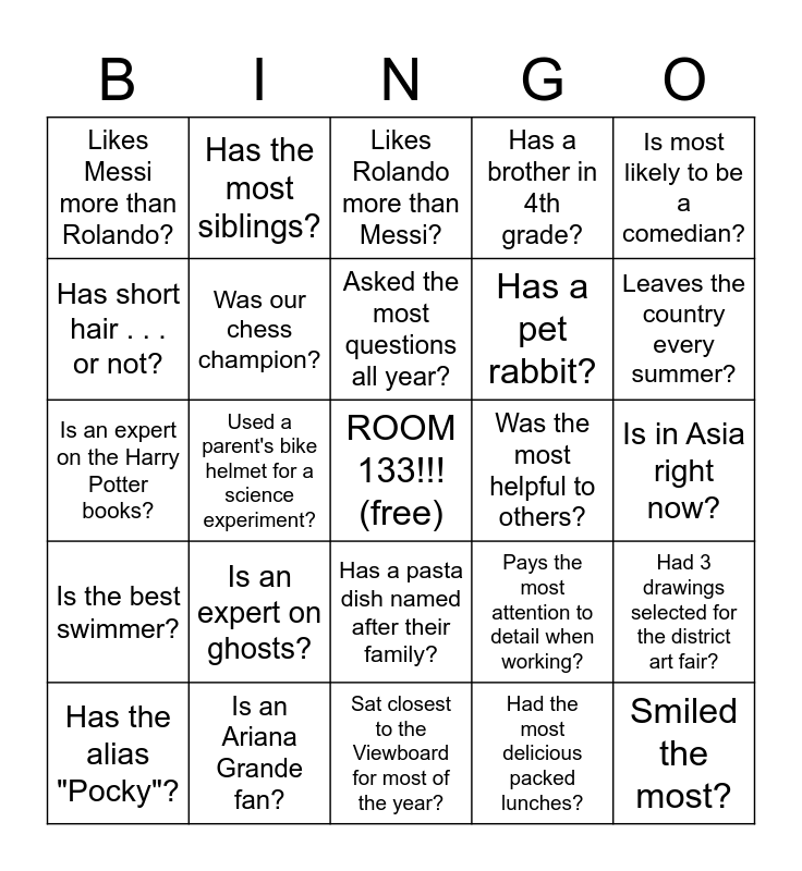This bingo card has a free space and 24 words: Is an expert on ghosts?, Is an Ariana Grande fan?, Asked the most questions all year?, Has the alias "Pocky"?, Is most likely to be a comedian?, Likes Messi more than Rolando?, Has short hair . . . or not?, Has the most siblings?, Was the most helpful to others?, Has a pasta dish named after their family?, Has a pet rabbit?, Is an expert on the Harry Potter books?, Pays the most attention to detail when working?, Had 3 drawings selected for the district art fair?, Was our chess champion?, Had the most delicious packed lunches?, Is in Asia right now?, Likes Rolando more than Messi?, Leaves the country every summer?, Used a parent's bike helmet for a science experiment?, Smiled the most?, Is the best swimmer?, Has a brother in 4th grade? and Sat closest to the Viewboard for most of the year?.