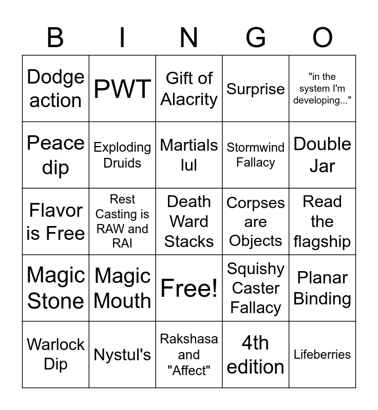 This bingo card has 26 words: Free!, 4th edition, Martials lul, Nystul's, "in the system I'm developing...", Dodge action, Peace dip, PWT, Read the flagship, Squishy Caster Fallacy, Stormwind Fallacy, Flavor is Free, Planar Binding, Warlock Dip, Rest Casting is RAW and RAI, Rules as Twitter, Surprise, Magic Stone, Gift of Alacrity, Death Ward Stacks, Double Jar, Rakshasa and "Affect", Corpses are Objects, Magic Mouth, Exploding Druids and Lifeberries.