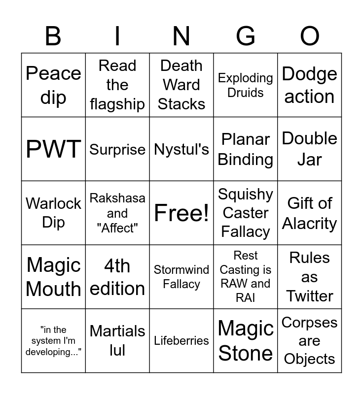 This bingo card has a free space and 24 words: 4th edition, Martials lul, Nystul's, "in the system I'm developing...", Dodge action, Peace dip, PWT, Read the flagship, Squishy Caster Fallacy, Stormwind Fallacy, Planar Binding, Warlock Dip, Rest Casting is RAW and RAI, Rules as Twitter, Surprise, Magic Stone, Gift of Alacrity, Death Ward Stacks, Double Jar, Rakshasa and "Affect", Corpses are Objects, Magic Mouth, Exploding Druids and Lifeberries.