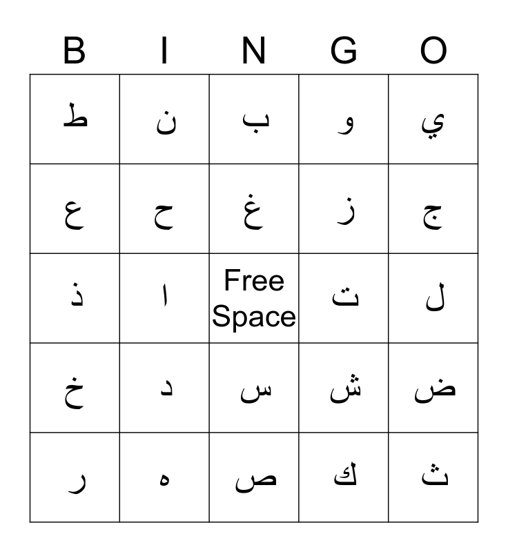 This bingo card has a free space and 24 words: د, ه, غ, ر, ي, ط, ع, ن, ت, س, ز, ذ, ش, ض, ح, ك, ل, ب, ج, ا, ث, خ, و and ص.