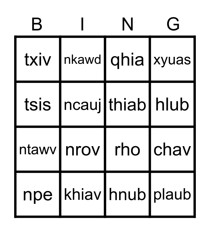 This bingo card has 23 words: plaub, dlev, hlub, mloog, tsis, txiv, ncauj, nkawd, npe, nqa, nrov, ntawv, nyiam, dhia, khiav, phau, qhia, rho, thiab, chav, xyuas, hnub and Hmoob.
