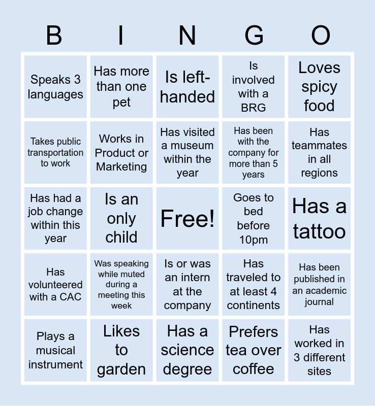 This bingo card has a free space and 24 words: Was speaking while muted during a meeting this week, Likes to garden, Has visited a museum within the year, Plays a musical instrument, Loves spicy food, Speaks 3 languages, Takes public transportation to work, Has more than one pet, Goes to bed before 10pm, Is or was an intern at the company, Has been with the company for more than 5 years, Has had a job change within this year, Has traveled to at least 4 continents, Has been published in an academic journal, Works in Product or Marketing, Prefers tea over coffee, Has a tattoo, Is left-handed, Has teammates in all regions, Is an only child, Has worked in 3 different sites, Has volunteered with a CAC, Is involved with a BRG and Has a science degree.