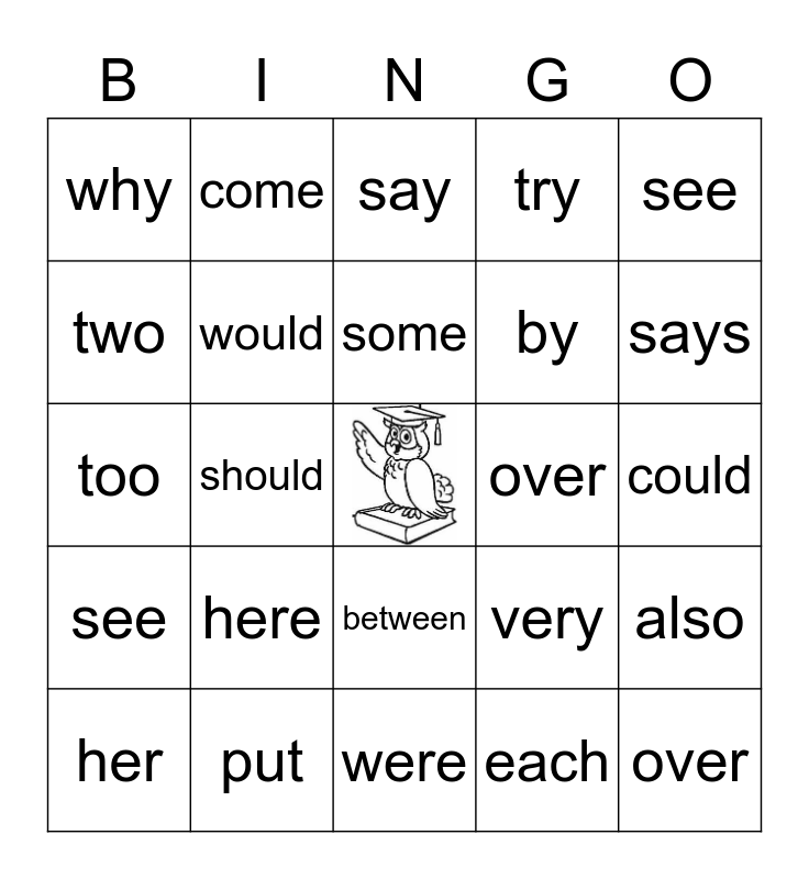 This bingo card has a free space and 24 words: here, put, some, her, see, why, two, come, over, between, by, too, very, also, would, each, could, say, says, should, over, see, try and were.