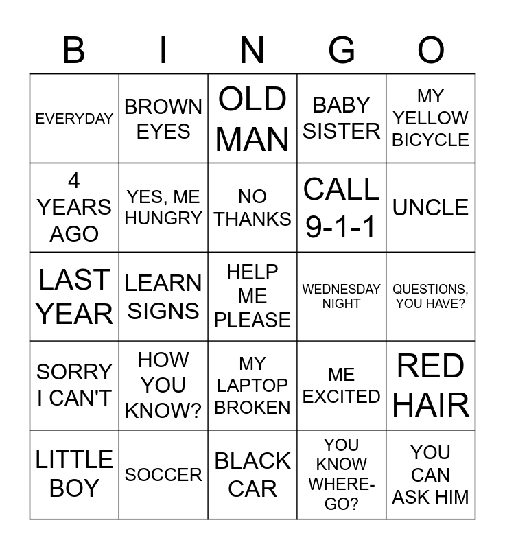 This bingo card has a free space and 27 words: ME EXCITED, YOU TIRED?, CALL 9-1-1, BLACK CAR, 4 YEARS AGO, OLD MAN, BROWN EYES, SORRY I CAN'T, WEDNESDAY NIGHT, RED HAIR, LAST YEAR, BABY SISTER, LITTLE BOY, SOCCER, UNCLE, YOUNG WOMAN, YES, ME HUNGRY, NO THANKS, HOW YOU KNOW?, EVERYDAY, QUESTIONS, YOU HAVE?, YOU KNOW WHERE-GO?, LEARN SIGNS, YOU CAN ASK HIM, MY LAPTOP BROKEN, MY YELLOW BICYCLE and YOU KNOW HOW-DRIVE?.