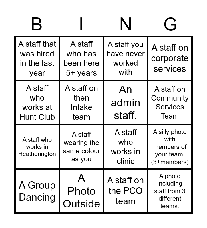 This bingo card has 19 words: A staff who works in clinic, A member of SLT? (Not your supervisor), A staff you have never worked with, A photo including staff from 3 different teams., A silly photo with members of your team. (3+members), A staff who works at Hunt Club, A staff on the PCO team, A staff that was hired in the last year, A staff who has been here 5+ years, A staff who works in Heatherington, A staff wearing the same colour as you, A staff on then Intake team, An admin staff., A Photo Outside, A Group Dancing, A Photobomb, A staff on corporate services, A staff on Community Services Team and A staff on Senior team.