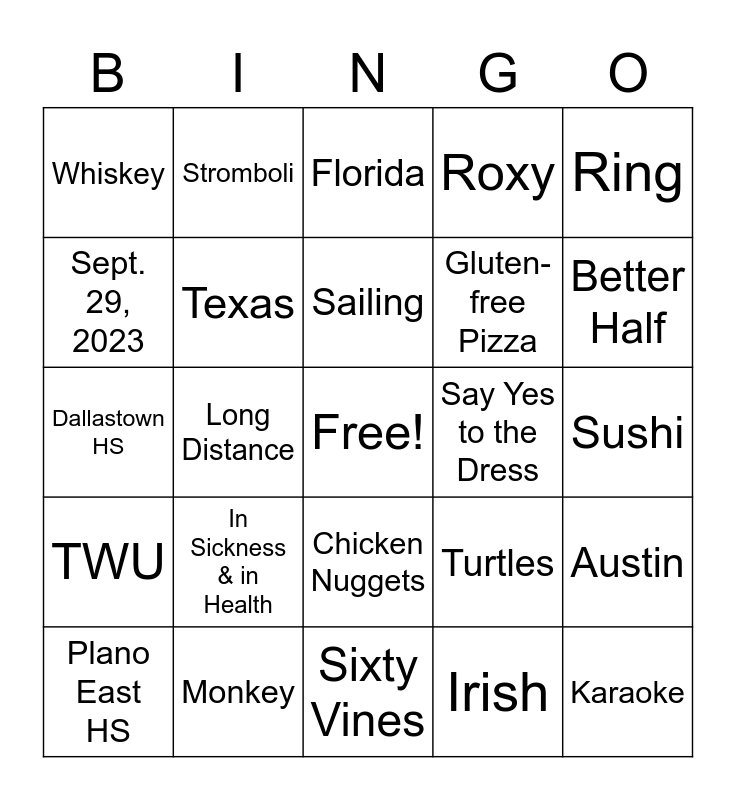 This bingo card has a free space and 73 words: Wine Wednesday, Wife, Whiskey, VW, Vodka, Viper, TWU, Tuxedo, Turtles, Truly, The Olana, The Lantern, Texas, Sushi, Sundried Tomatoes, Stromboli, Sixty Vines, Sept. 29, 2023, Scorpio, Say Yes to the Dress, Sailing, Roxy, Ring, Purple, Plano East HS, Pennsylvania, Penn State, Pearl, Nissan, Napolis, Monkey, Mexican Sugar, Mercury in Retrograde, Mac n' CHeese, Long Distance, Live Music, Lily, Lifetime, Karaoke, Jamaica, Irish, In Sickness & in Health, Husband, Happily Ever After, Golf, Gluten-free Pizza, Florida, Figgie, Drums, Dallastown HS, Dallas Stars, Croation, Crab Legs, Cowboys, Cowboy Hat, COVID, Chocolates, Chicken Nuggets, Chef, Charleston, Cancer, Boots, Blue, Better Half, Bella, Beach Ready, Ball & Chain, Bagheera, Austin, #broke, Nov. 6, June 26 and April 28.
