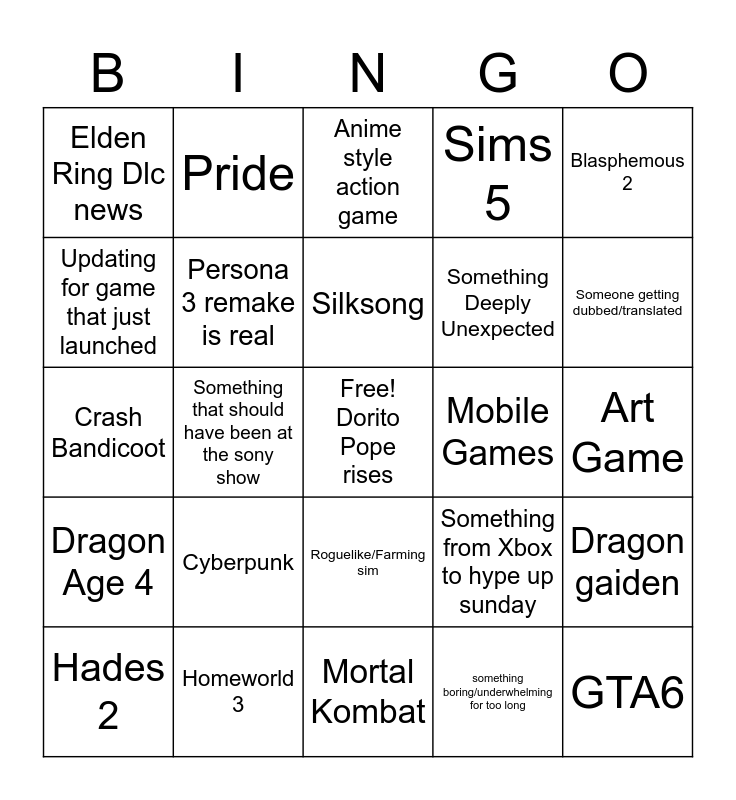 This bingo card has a free space and 24 words: Cyberpunk, Homeworld 3, Silksong, Hades 2, Blasphemous 2, Elden Ring Dlc news, Updating for game that just launched, Pride, Mobile Games, Roguelike/Farming sim, Something Deeply Unexpected, Crash Bandicoot, Something from Xbox to hype up sunday, Dragon gaiden, Persona 3 remake is real, something boring/underwhelming for too long, Art Game, Anime style action game, Someone getting dubbed/translated, Something that should have been at the sony show, GTA6, Dragon Age 4, Sims 5 and Mortal Kombat.