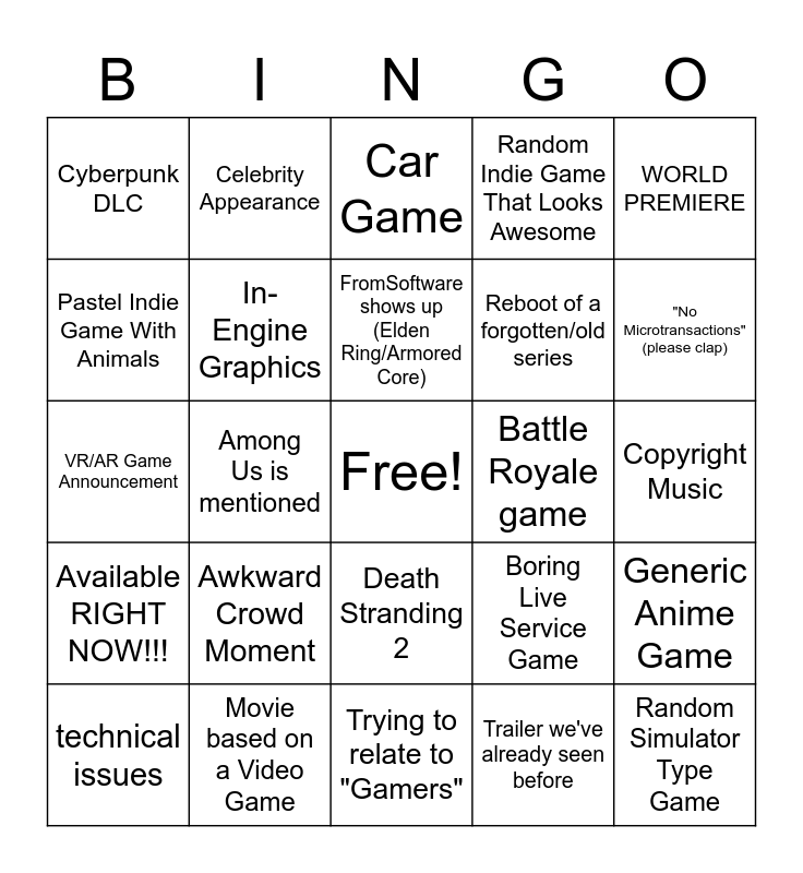 This bingo card has a free space and 26 words: Death Stranding 2, Trailer we've already seen before, FromSoftware shows up (Elden Ring/Armored Core), Movie based on a Video Game, WORLD PREMIERE, Cyberpunk DLC, Pastel Indie Game With Animals, Celebrity Appearance, Copyright Music, Boring Live Service Game, Reboot of a forgotten/old series, VR/AR Game Announcement, Generic Anime Game, technical issues, Among Us is mentioned, Game Pass Day 1, Random Indie Game That Looks Awesome, Available RIGHT NOW!!!, Car Game, Random Simulator Type Game, "No Microtransactions" (please clap), Trying to relate to "Gamers", Battle Royale game, Awkward Crowd Moment, In-Engine Graphics and Character Added To Fortnite.